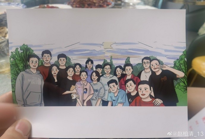 赵柏清写道:“两年才有了班级的第一次大合照,人最齐的一次,祝大家毕业快乐,愿各位前程似锦,我再留一年吧hhah,追星成功咯@丁宁。”