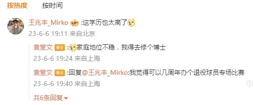 媒体人王兆丰评论说:“这学历也太高了。”袁堂文回复道:“家庭地位不稳,我得去修个博士。”