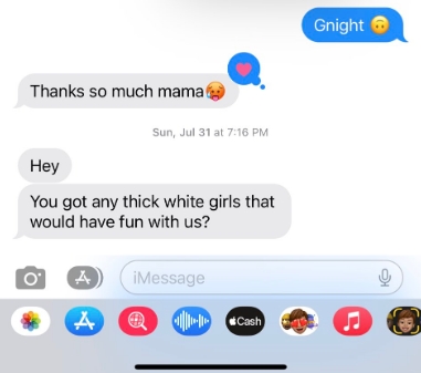 Moriah Mills还晒出了一张截图,图中的“锡安”表示想要Moriah Mills找一个白人女孩跟他俩“一起玩”。