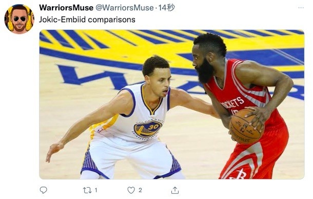 赛后勇士媒体Warriors Muse晒出库里和哈登的对位图,写道:“约基奇和恩比德之间的比较(就好比库里和哈登之间的比较)。”