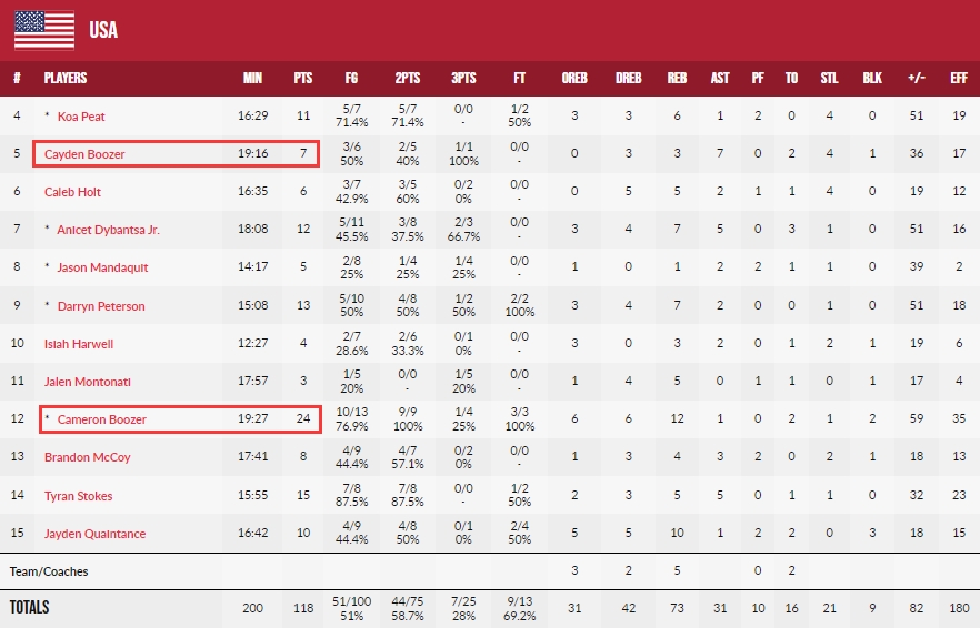 被知名选秀网站247 Sports排在2025届高中生第一名的卡梅隆-布泽尔,本场出战19分钟,13投10中(三分4中1),罚球3中3,拿到全场最高的24分以及12个篮板。他也以场均16.8分9.8篮板1.2助攻2.5抢断的数据,当选本届赛事的MVP。