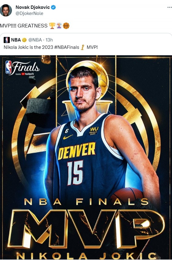 约基奇获得了总决赛MVP,塞尔维亚网球名将德约科维奇转推并称赞道:“MVP!!!!伟大🏆🃏🏀。”