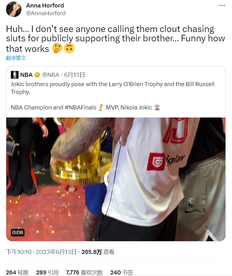 “啊?我怎么没看到有人因为约基奇哥哥们支持自己的兄弟然后被人称为蹭流量的荡妇呢?真的很搞笑。”霍福德妹妹写道。
