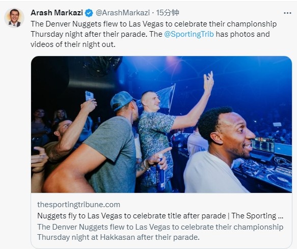 而据媒体人Arash Markazi报道,掘金在夺冠游行庆祝结束后,全队当天又飞到了拉斯维加斯继续庆祝。