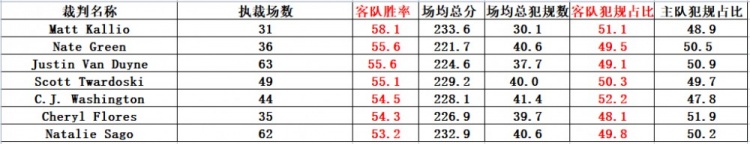 在2022-23赛季常规赛中,客场哨最为明显的裁判为Matt Kallio,在他吹罚的31场比赛中,客队胜率达到58.1%,Nate Green吹罚36场比赛,客队胜率达到56.6%,胜率5成以上的7名裁判详情如下: