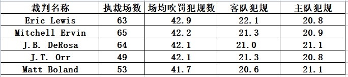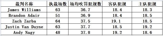 场均吹罚犯规最少的裁判为James Williams,在他参与执裁的63场比赛中,裁判组场均吹罚36.7次犯规,其中客队犯规18.4次,主队犯规18.3次。