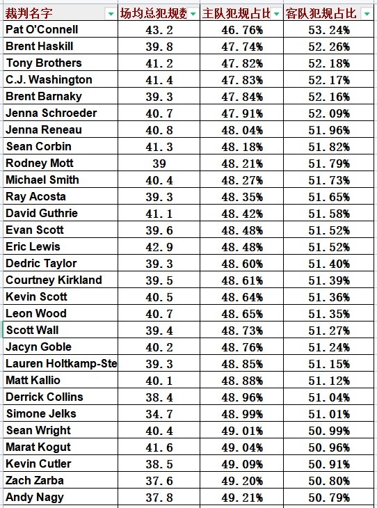 其中针对客队的吹犯规比例最多的裁判为Pat O'Connell,他场均吹罚43.2次犯规,客队犯规占比达到53.24%。