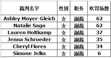 ●此外,本赛季共有6名女裁判吹罚了比赛,她们一共参与吹罚了236场比赛,均作为副裁,其中Ashley Moyer-Gleich与Natalie Sago参与吹罚了62场比赛。