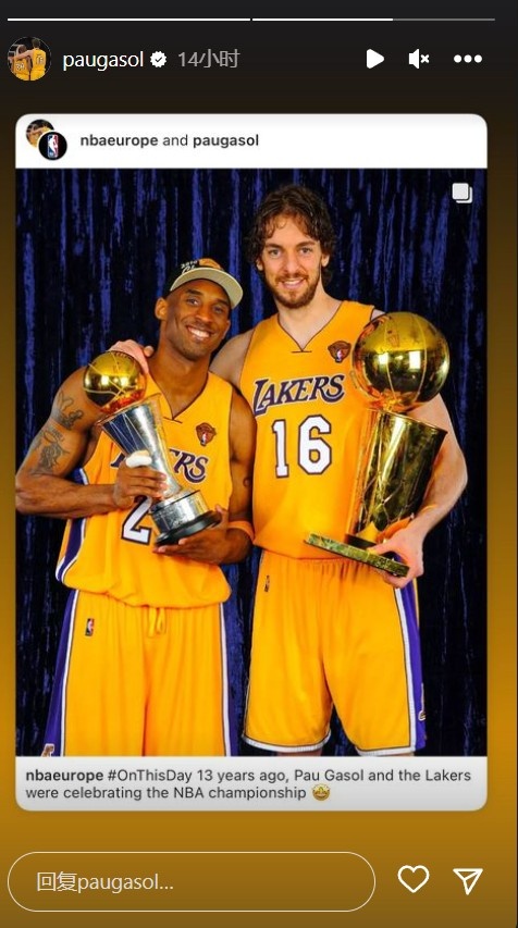 直播吧6月18日讯 今日大加索尔更新INS,晒出了13年前与科比一起夺得NBA总冠军的照片。