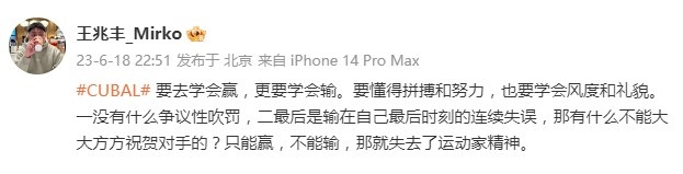 对此,篮球评论员王兆丰发文写道:“要去学会赢,更要学会输。要懂得拼搏和努力,也要学会风度和礼貌。一没有什么争议性吹罚,二最后是输在自己最后时刻的连续失误,那有什么不能大大方方祝贺对手的?只能赢,不能输,那就失去了运动家精神。 ”