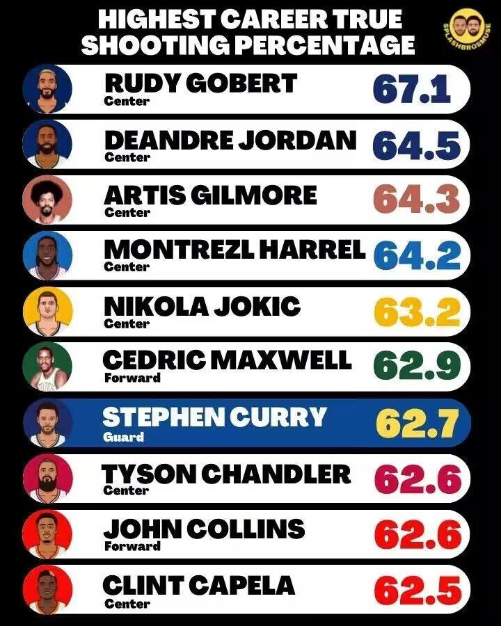此前结束的NBA总决赛中,掘金4-1击败热火夺得队史首冠,斩获FMVP的约基奇让人们联想起曾经的“中锋时代”。不过在如今的联盟当中,中锋们的待遇显然不及曾经的中锋盛世,但在一项历史排行榜上,中锋们仍然依靠位置优势占据统治地位,今天老震带大家盘点下生涯真实投篮命中率排行榜。
