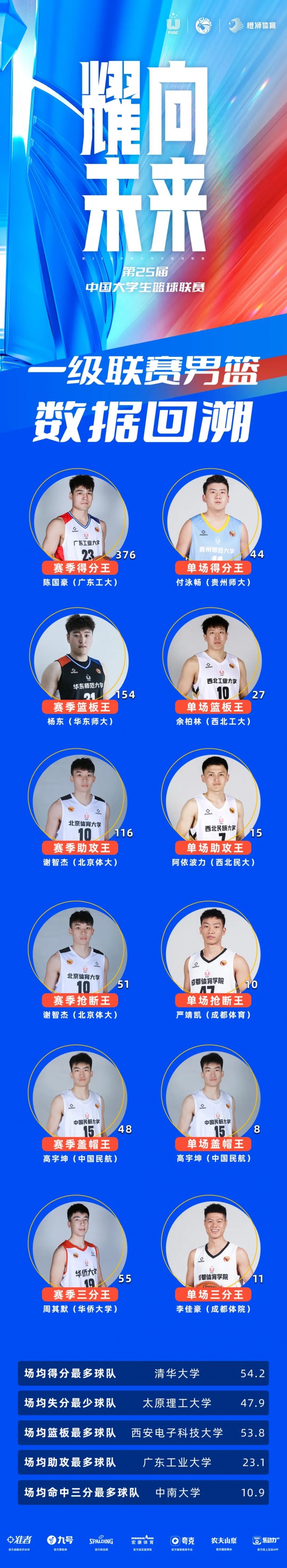 本赛季男篮数据方面,陈国豪拿下赛季得分王,北京体大的谢智杰包揽赛季助攻王和抢断王,华东师大的杨东拿下赛季篮板王,中国民航高宇坤拿下赛季盖帽王,华侨大学周其默获得赛季三分王!