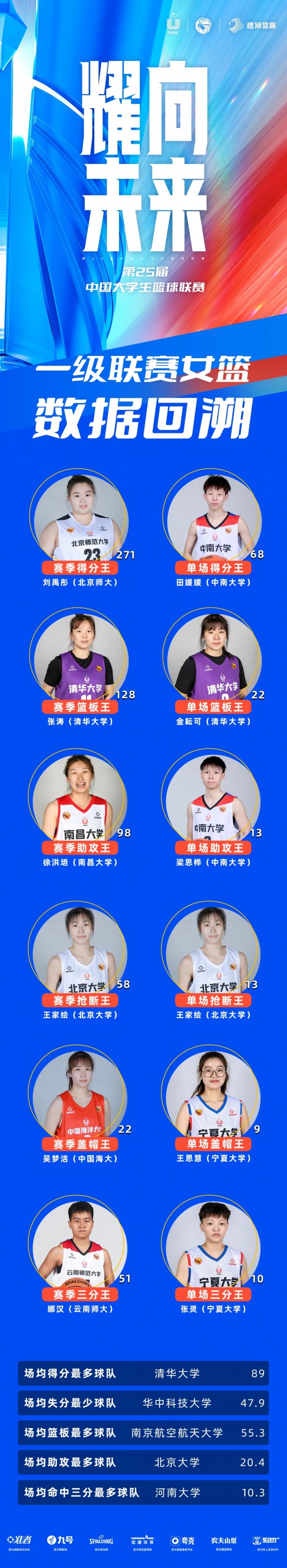 女篮数据方面,北京师大刘禹彤摘的赛季得分王!清华大学张涛夺得赛季篮板王,南昌大学徐洪培拿下赛季助攻王,北京大学王家绘获得赛季抢断王,中国海大吴梦洁拿下赛季盖帽王,云南师大娜汉夺得赛季三分王。