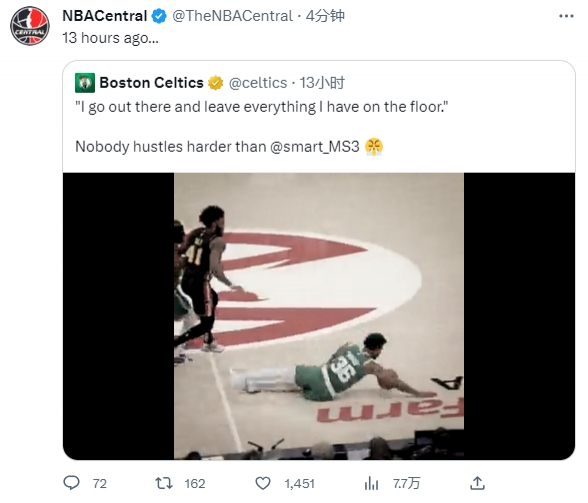 13小时前,凯尔特人官推晒斯玛特集锦,并引用斯玛特昔日采访——“我在球场会不遗余力、竭尽我所能。”同时配文:“没人能像斯玛特一样打得这么拼。”
