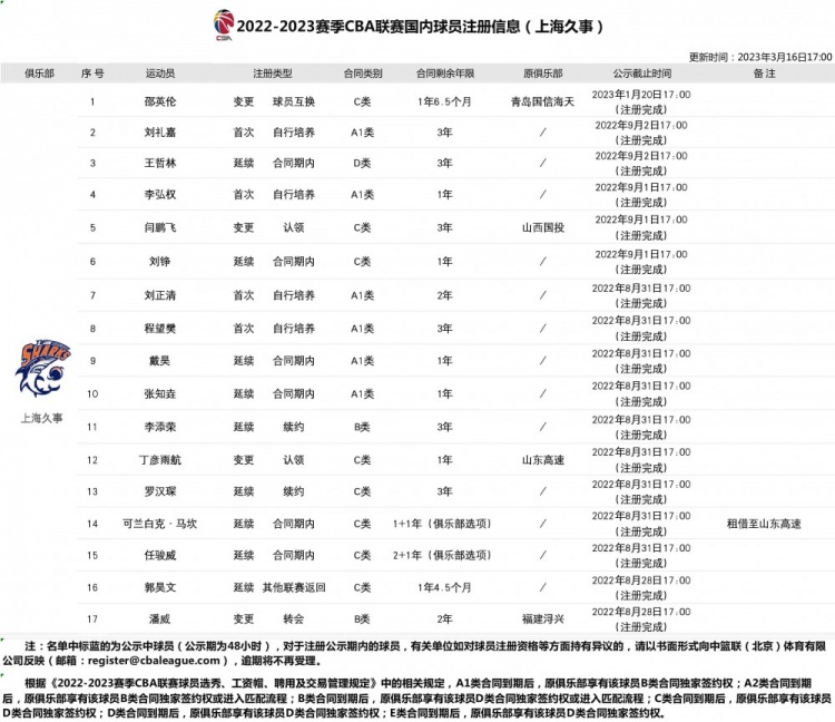 值得一提的是,上海男篮目前只有王哲林一名D类合同球员,他们还有两个顶薪球员名额可用(一支球队最多能有三个顶薪球员)。