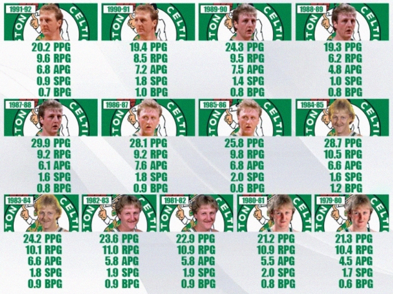 伯德身高2米06,三次带队夺得NBA总冠军,连续三年当选常规赛MVP,10次入选最佳阵容(9次一阵),3次入选最佳防守阵容,12次入选全明星,3届全明星三分王。