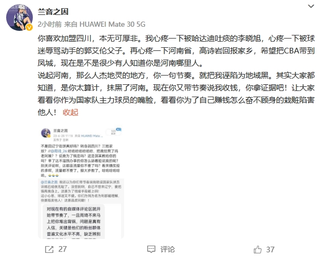 说起河南,那么人杰地灵的地方,你一句节奏。就把我诬陷为地域黑。其实大家都知道,是你太算计,抹黑了河南。现在你又带节奏说我收钱,你拿证据吧!让大家看看你作为国家队主力球员的嘴脸,看看你为了自己赚钱怎么奋不顾身的栽赃陷害他人!”