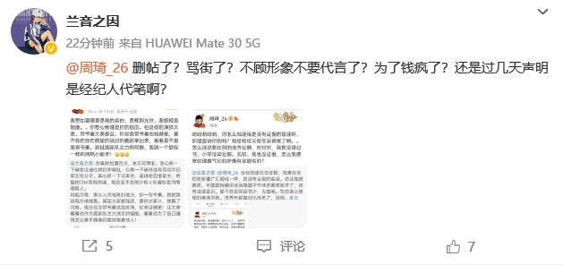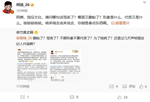 “删帖了?骂街了?不顾形象不要代言了?为了钱疯了?还是过几天声明是经纪人代笔啊?”