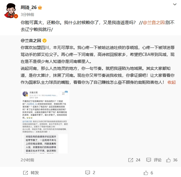 直播吧6月28日讯 近日,媒体人@兰音之因发文谈到了有关周琦转会一事。随后,周琦现身评论区与@兰音之因展开“对线”。