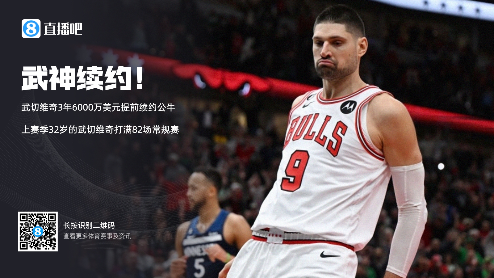 直播吧6月29日讯 据The Athletic名记Shams报道,多位消息人士透露,公牛和中锋武切维奇接近达成3年6000万美元的提前续约合同。