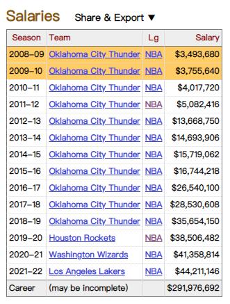 这样,威少将迎来生涯第三低的年薪,最低是菜鸟赛季的350万美元,第二低是生涯第二年的376万美元。
