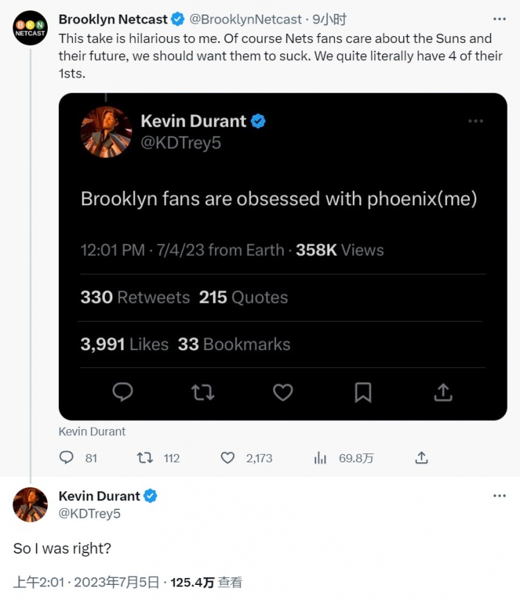 杜兰特:“为什么你关心我所担心的事情?严肃的问题。我在推特上给篮网球迷发消息,你担心什么?”