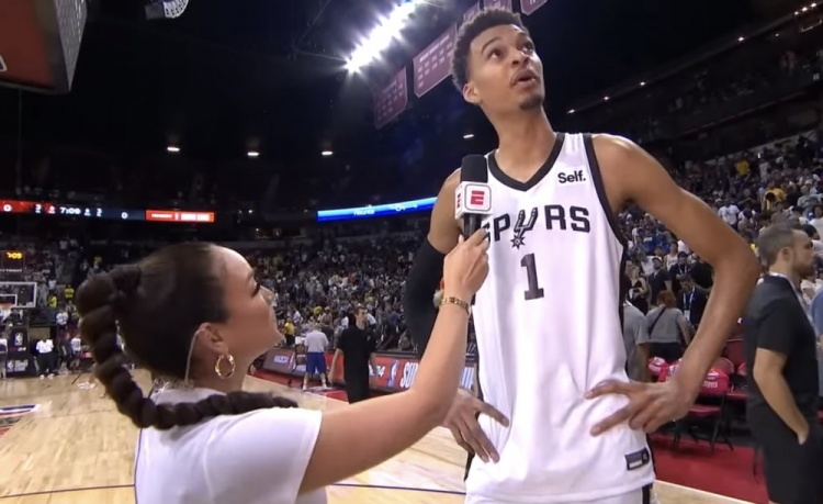 直播吧7月8日讯 赌城夏联,马刺最终76-68战胜黄蜂。赛后,文班亚马在场边接受了采访。