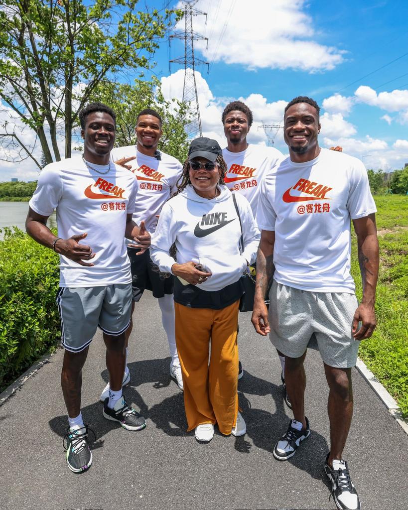 直播吧7月9日讯 雄鹿球星字母哥在社媒晒出了四兄弟与母亲维罗妮卡在中国行时的合照。
