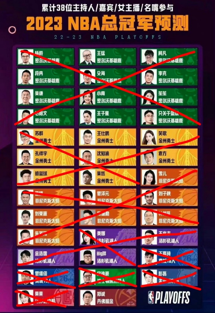 在2022-23赛季的季后赛开打前,38名专家或主播对总冠军进行了预测,殳海、杨毅均选择了字母哥所在的雄鹿。而雄鹿在首轮被热火黑八,爆冷出局。