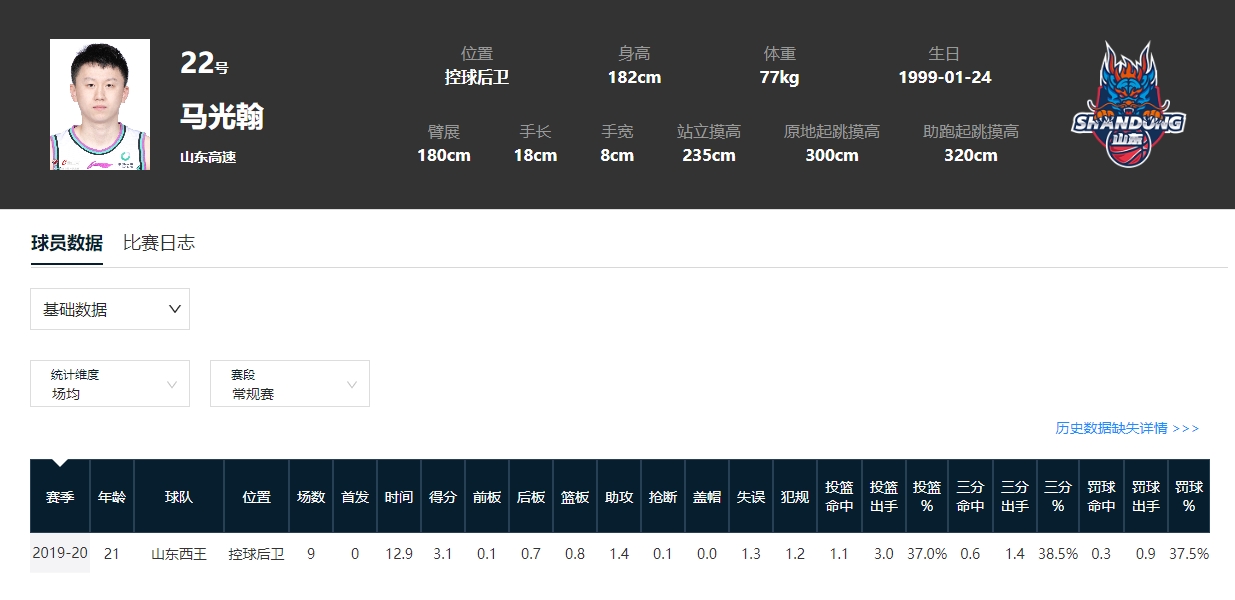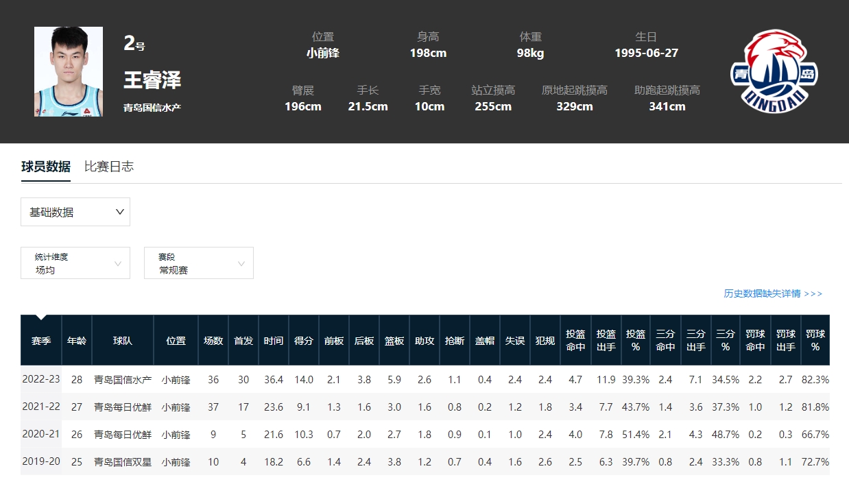 伤愈复出后的这两个赛季,王睿泽已经成为青岛队外线不可或缺的稳定火力点,上赛季场均14分5.9篮板2.6助攻1.1抢断,均为生涯最高。