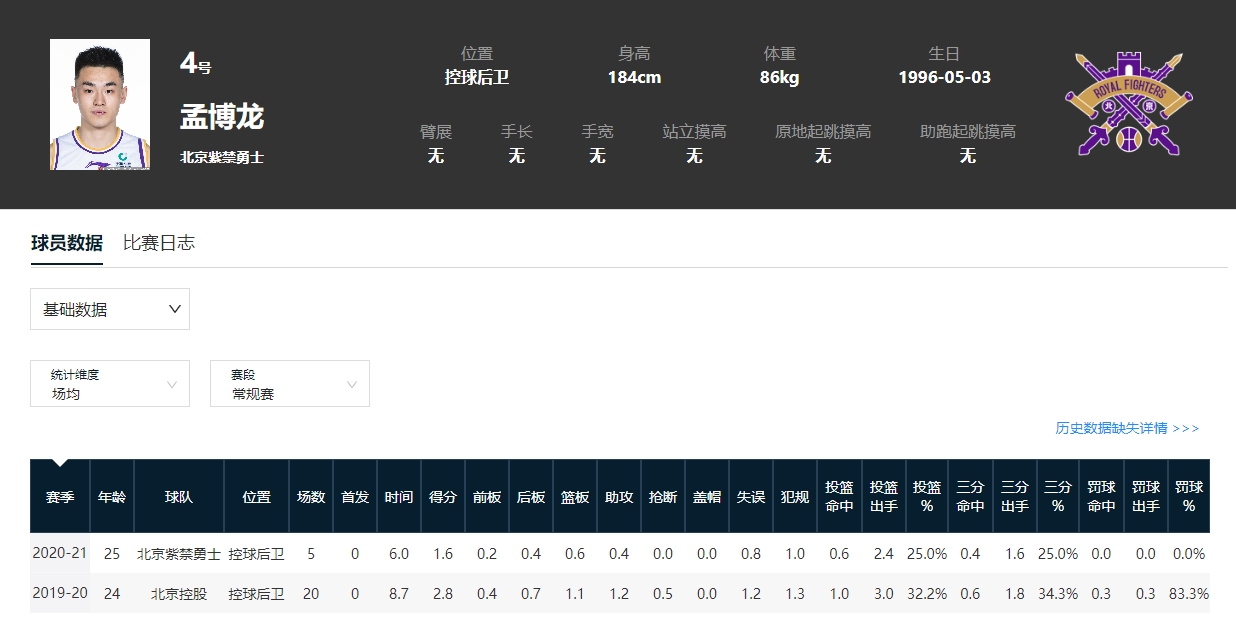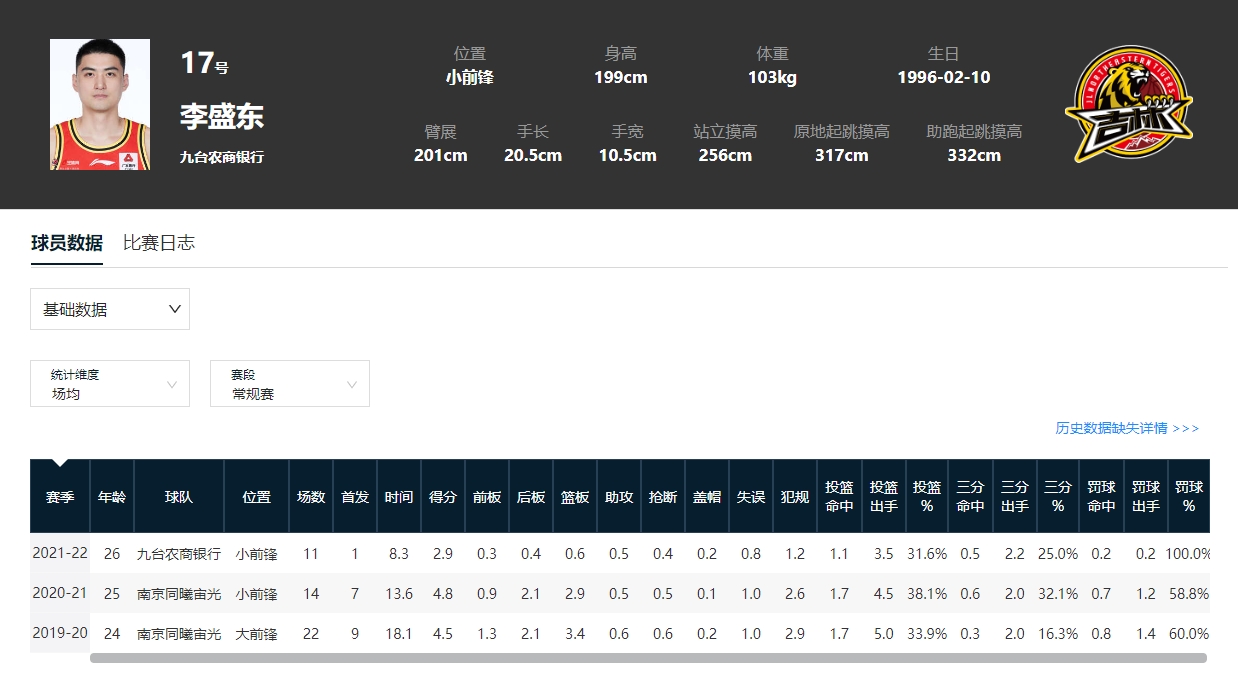 2019年来到CBA后,吴永盛的表现机会也不多,目前返回宝岛P+联赛效力,上赛季场均也仅有6.2分。