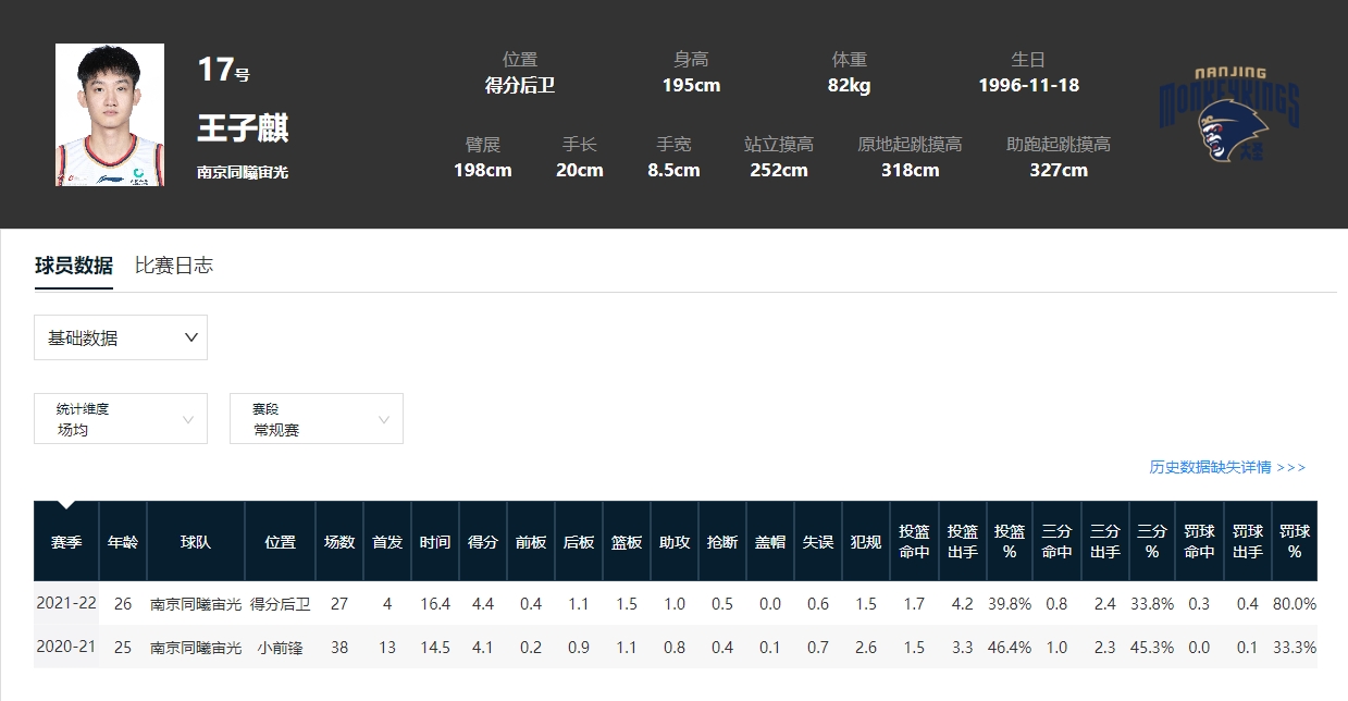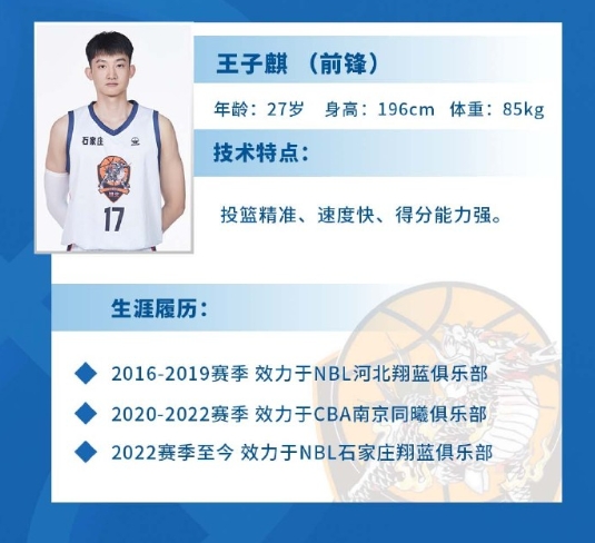 王子麒出生于石家庄,出自NBL河北翔蓝队,在CBA同曦队效力两年后,又回到NBL母队。