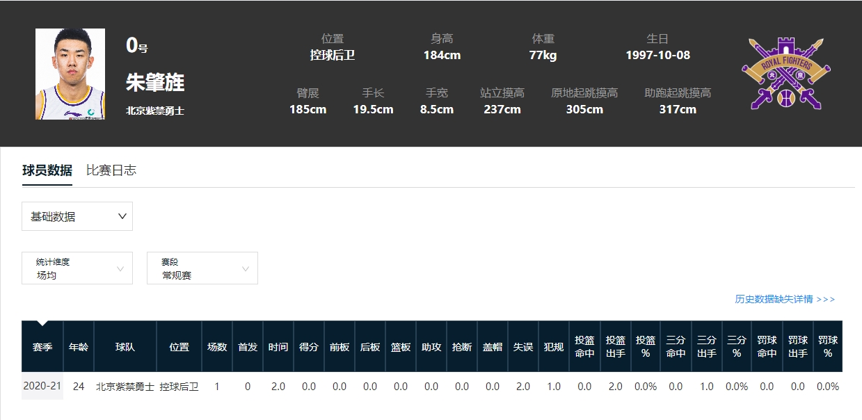 18、【次轮第14顺位:朱肇旌 北控】(仅在CBA出战1场;已不在CBA)