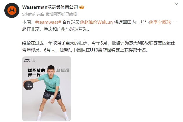 经纪公司昨晚发文 赵维伦将在本周返回国内 参加李宁的活动