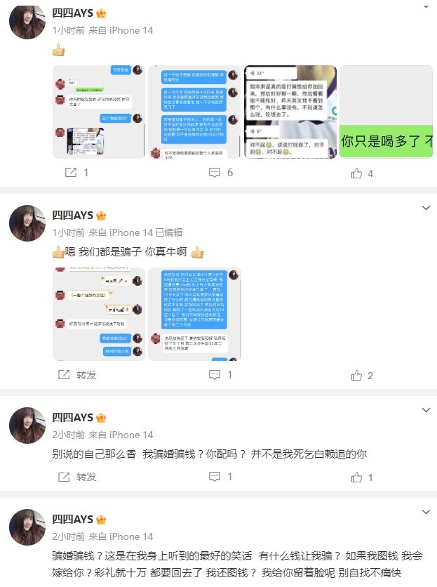 她写道:“骗婚骗钱?这是在我身上听到的最好的笑话。有什么钱让我骗? 如果我图钱 我会嫁给你?彩礼就十万,都要回去了,我还图钱? 我给你留着脸呢, 别自找不痛快!”