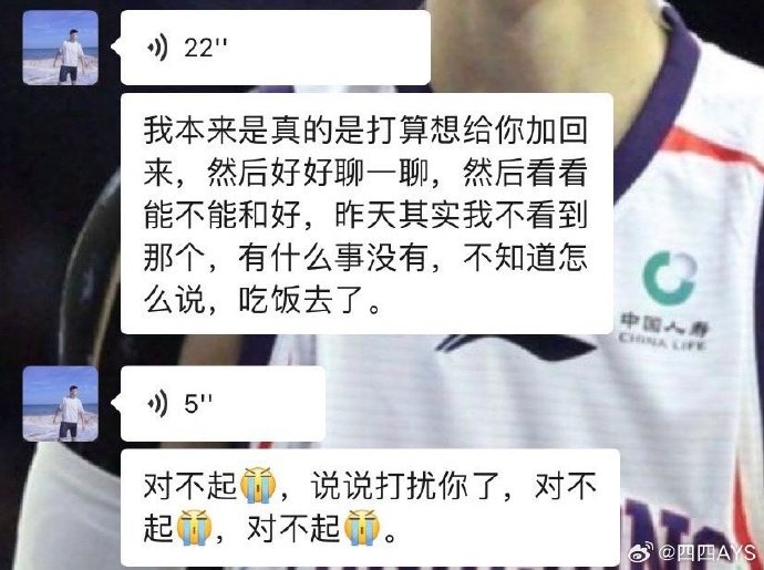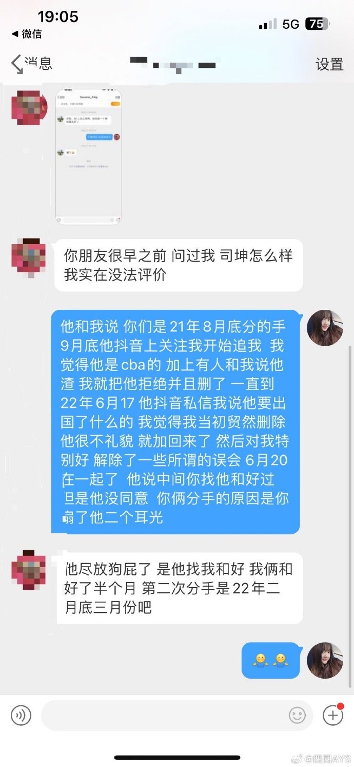 直播吧7月29日讯 今天,湾区翼龙球员司坤的妻子李佳佳更新社媒,晒出与疑似曾是司坤女友的聊天截图。