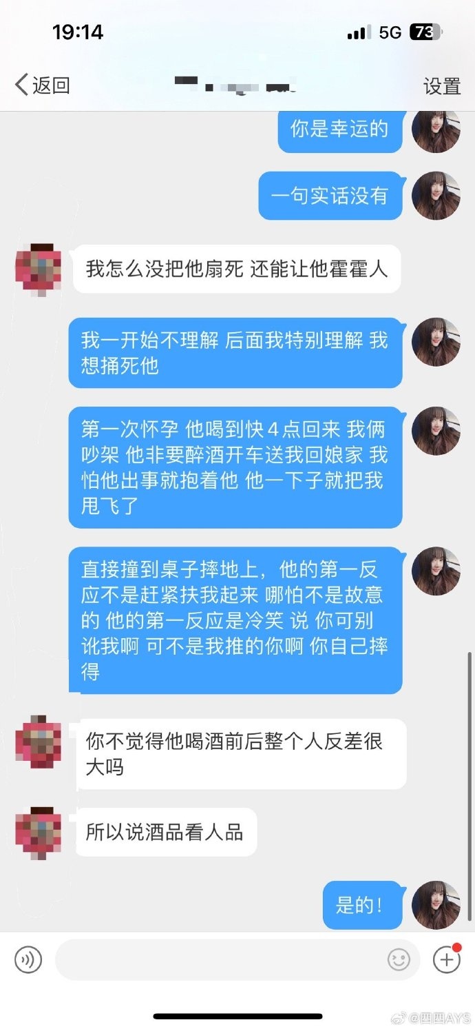 根据图中的对话内容,李佳佳说司坤曾在酒后把她推到在地,当时她是怀孕期间。而此前司坤与前女友并没有分手就与李佳佳在一起,而期间司坤还和前女友复合。