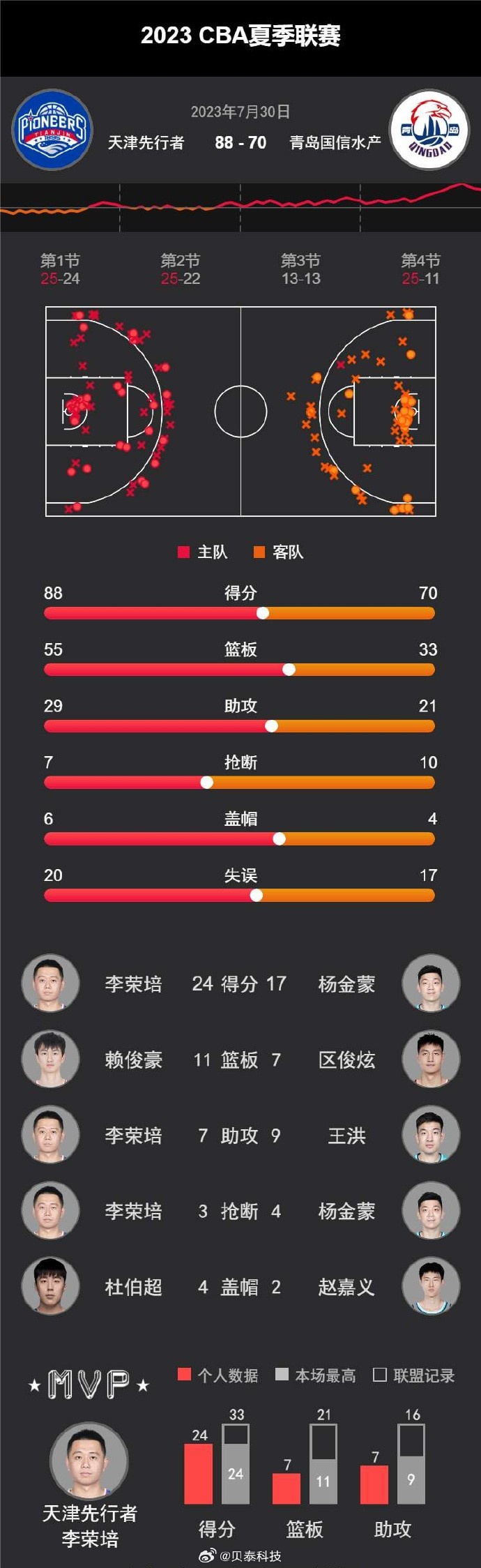 直播吧7月30日讯 2023年CBA夏季联赛裕民站,青岛70-88不敌天津。