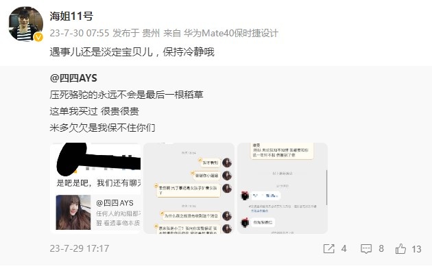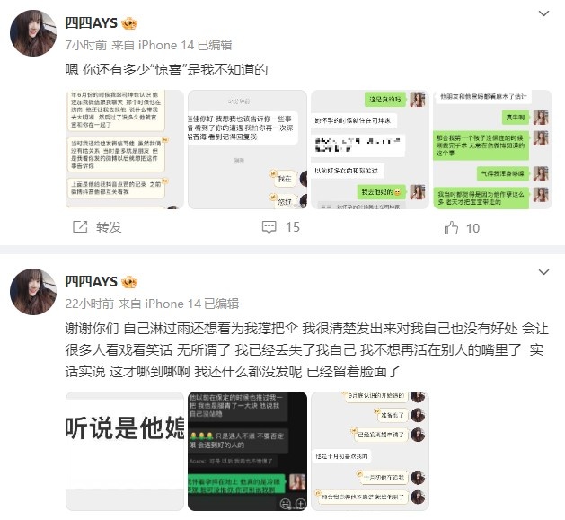 随后,李佳佳再晒出多张聊天记录截图,并写道:“谢谢你们,自己淋过雨还想着为我撑把伞,我很清楚发出来对我自己也没有好处,会让很多人看戏看笑话。无所谓了,我已经丢失了我自己,我不想再活在别人的嘴里了。实话实说,这才哪到哪啊,我还什么都没发呢,已经留着脸面了。”
