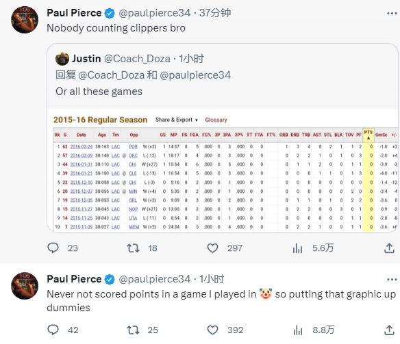 随后一名网友晒出了皮尔斯在快船时多场得分挂蛋的截图。皮尔斯则回应道:“没人会算快船的。”