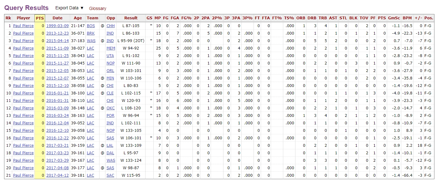 据了解,皮尔斯职业生涯共有21场比赛没有得分进账,其中在凯尔特人1场,在篮网1场,在奇才1场,在快船18场。
