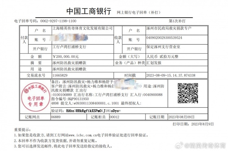 “我公司代表女篮球员杨力维、杨舒予向河北涿州灾区捐款人民币20万元!在这场洪涝灾害中,需要更多的爱心和支持,让我们一起为受灾民众送去温暖和力量,早日重建家园!”精英传奇体育在其官博上写道。
