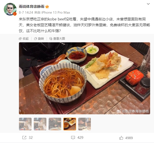 直播吧8月12日讯 知名网红解说员徐静雨,本周早些时候开启了日本之行,期间高度赞扬了东京的一家街边小店,并表示美女老板厨艺精湛开朗健谈。