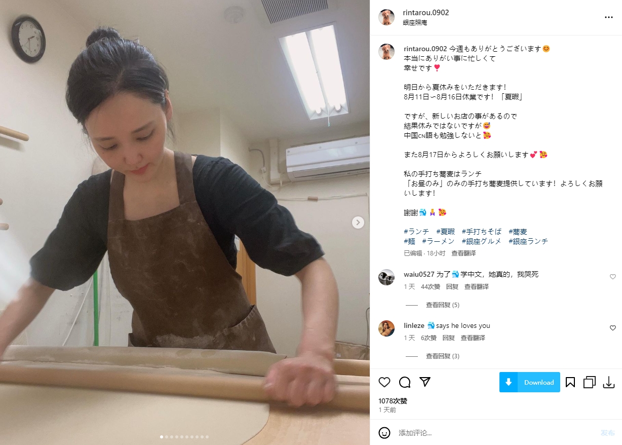 随后,广大国内网友找到了美女老板的Instagram,并纷纷表示“一个方脑袋中国人说你做的面大大的好吃”。