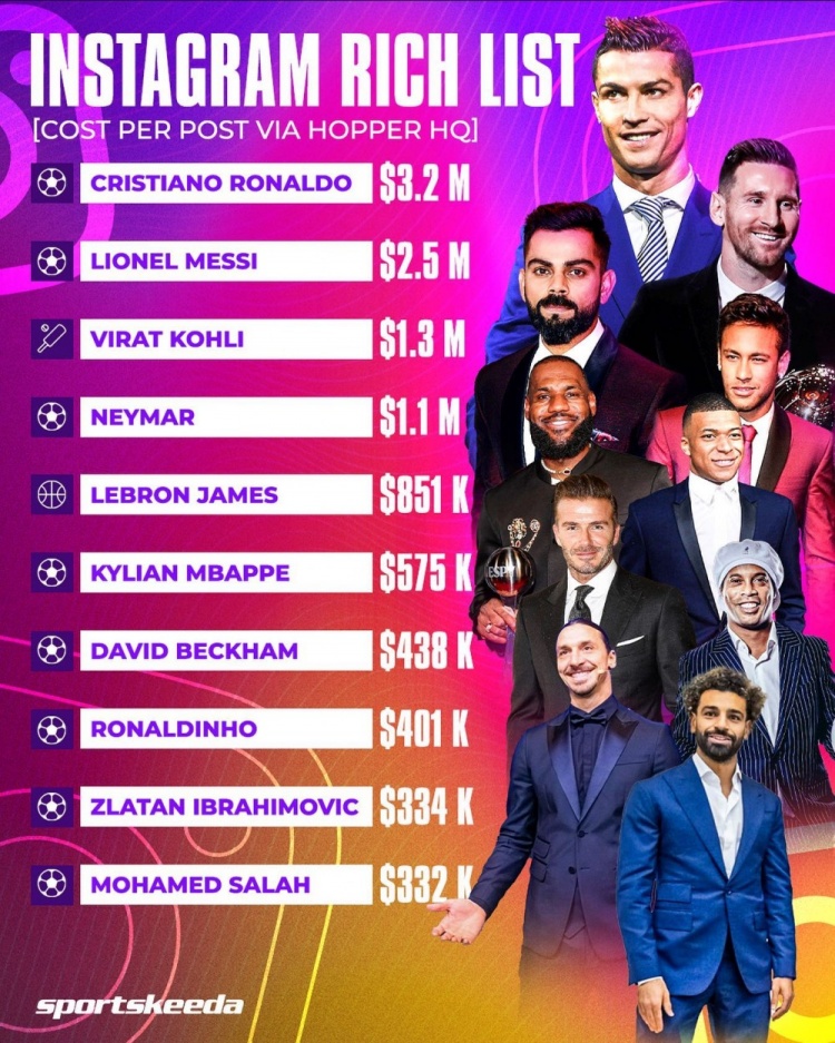 直播吧8月13日讯 据美媒TheSportsrush报道,詹姆斯每条INS的价值达到了85.1万美元,在体育届中排名第5。