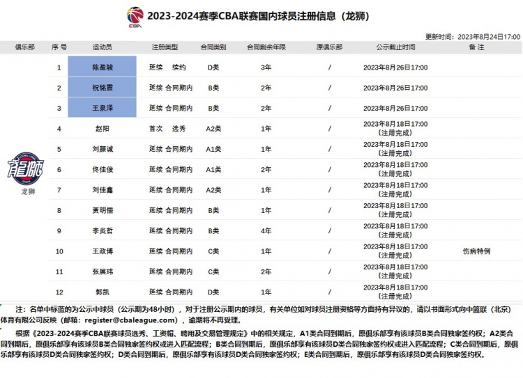 其中,陈盈骏D类合同续约3年,祝铭震、王泉泽合同期内延续,出现在注册名单里。