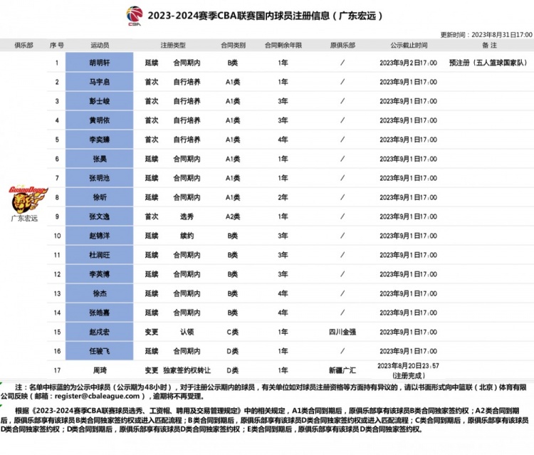 直播吧8月31日讯 CBA官方更新了国内球员注册信息,广东男篮新增16人注册信息。