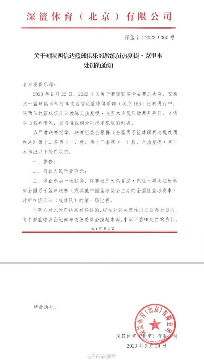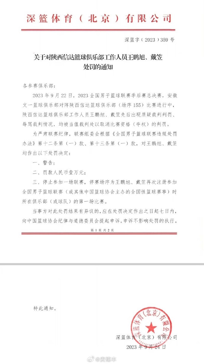 随后,官方也公布了对陕西信达教练和工作人员的处罚通知,详情如下: