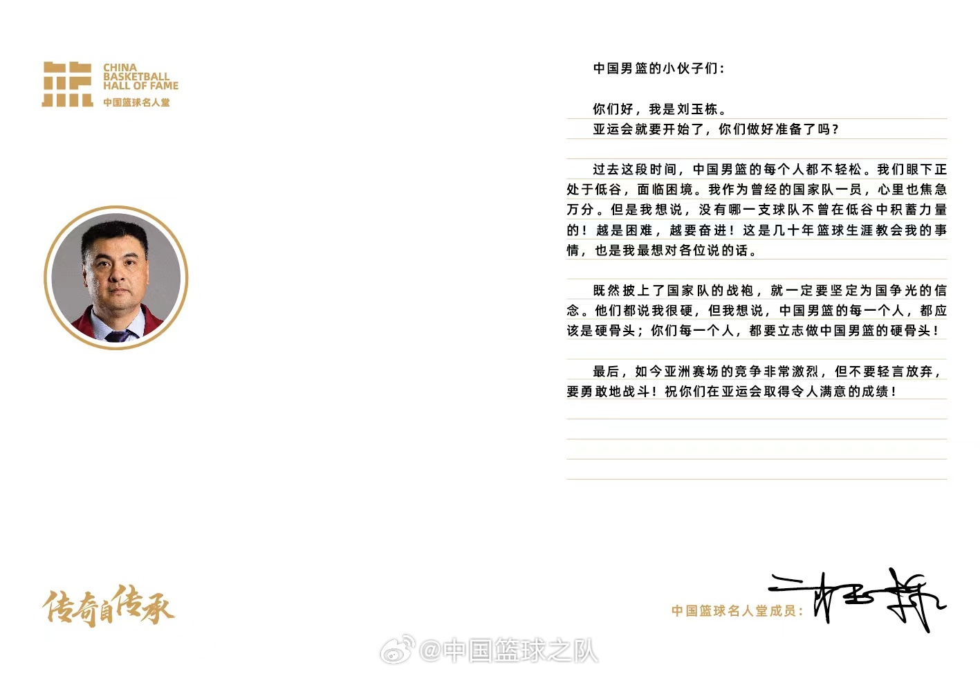 据中国篮球之队官微透露,中国篮球名人堂成员刘玉栋、胡卫东给即将出战亚运会比赛的中国男篮小伙子们寄来信件,表达了对小伙子们的激励与期待。男篮队长赵继伟为大家朗读了前辈的信件。