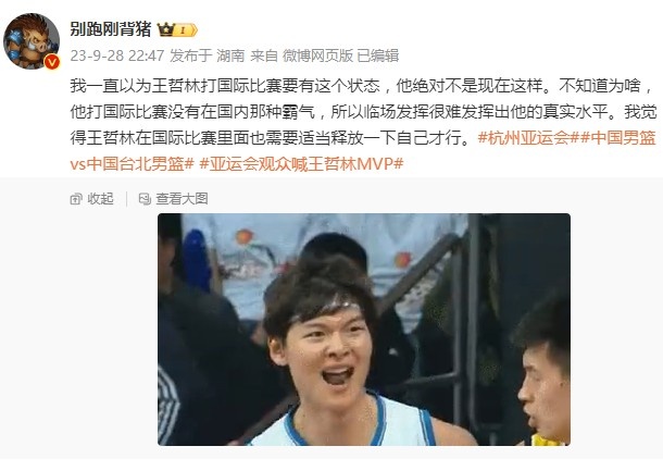 赛后,媒体人@别跑刚背猪发文写道:“我一直以为王哲林打国际比赛要有这个状态,他绝对不是现在这样。不知道为啥,他打国际比赛没有在国内那种霸气,所以临场发挥很难发挥出他的真实水平。我觉得王哲林在国际比赛里面也需要适当释放一下自己才行。”